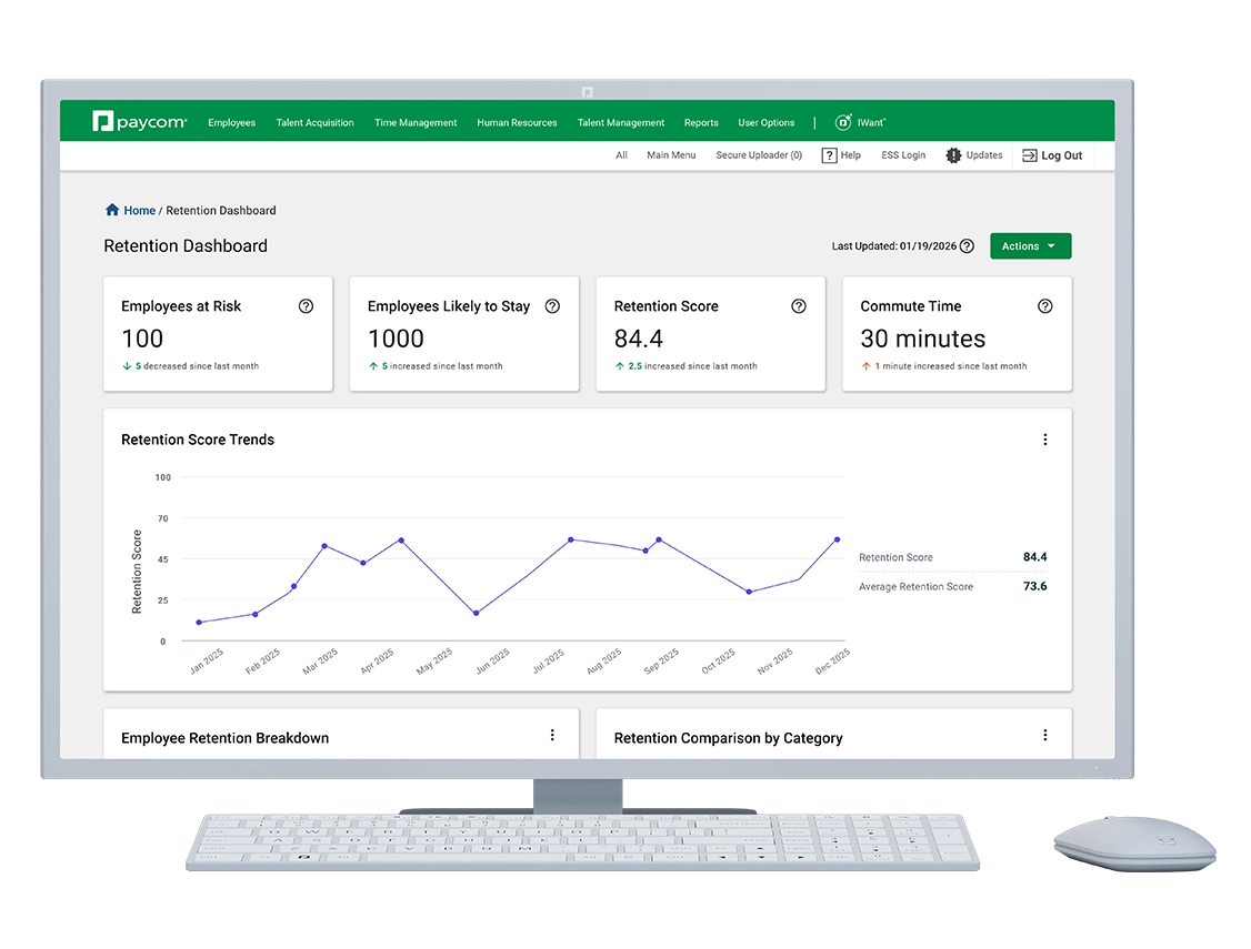 The Retention Dashboard analyzes your organization’s employee data to generate predictive analytics showing companywide retention trends and highlight employees at the highest risk of departure and those most likely to stay. Paycom’s Retention Dashboard uses a proprietary algorithm based on more than 30 data points to automatically generate a retention score for every employee, giving HR managers and executives real‑time, data‑driven insights into companywide retention trends and potential turnover hot spots. Thanks to Paycom’s single-database architecture, retention scores update automatically as employee data changes, so leaders always have the most current view of risk across their organization.