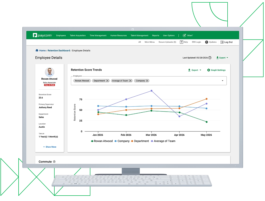 When you’re unable to pinpoint and address the causes of turnover, it can erode culture, performance and your reputation. Paycom’s Retention Dashboard analyzes more than 30 points of employee data, generating predictive analytics that show companywide retention trends and highlight employees at the highest risk of departure and those most likely to stay.